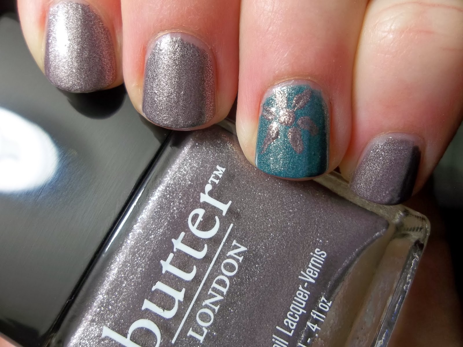 I used Tea Beauty Cherry Blossom (yes, it does smell fruity!) on my accent nail because I *thought* it would make a good base for these water decals as it matches one of the flower petals exactly... however I did not realize the decals are actually translucent, so alas you can barely see the true colors. And the small details were lost completely. :( Guess I need to put them over a light color! However, the glittery center is still pretty nifty as you can see.